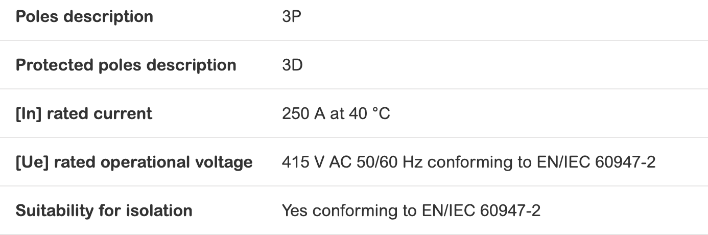 È un interruttore completo di 3 poli fatto di un telaio da 400a e di un'unità di viaggio magnetico termico (TMD). MCCB ha un buon rapporto di prestazione dei prezzi per le applicazioni di base e offre una protezione elettrica affidabile per le applicazioni. La capacità di rottura (ICU) è di 36KA RMS a 415VAC 50/60Hz. La tensione operativa è 415VAC 50/60Hz. Questo prodotto incorpora un'unità di viaggio termico-magnetica (TMD) di valutazione 250A (in). Questa unità di viaggio TMD fornisce una protezione termica regolabile IR (contro i sovraccarichi) con un'impostazione da 0,7XIN a 1xina (175A-25-50A). E fornisce una protezione magnetica fissa (contro i cortometraggi) impostato su 12xin (3000A). MCCB viene fornito con una varietà di accessori opzionali semplici da scegliere e da installare. Le dimensioni del prodotto sono 120 mm (larghezza) x 205 mm (altezza) x 105 mm (profondità). Il peso è di 3,5 kg.