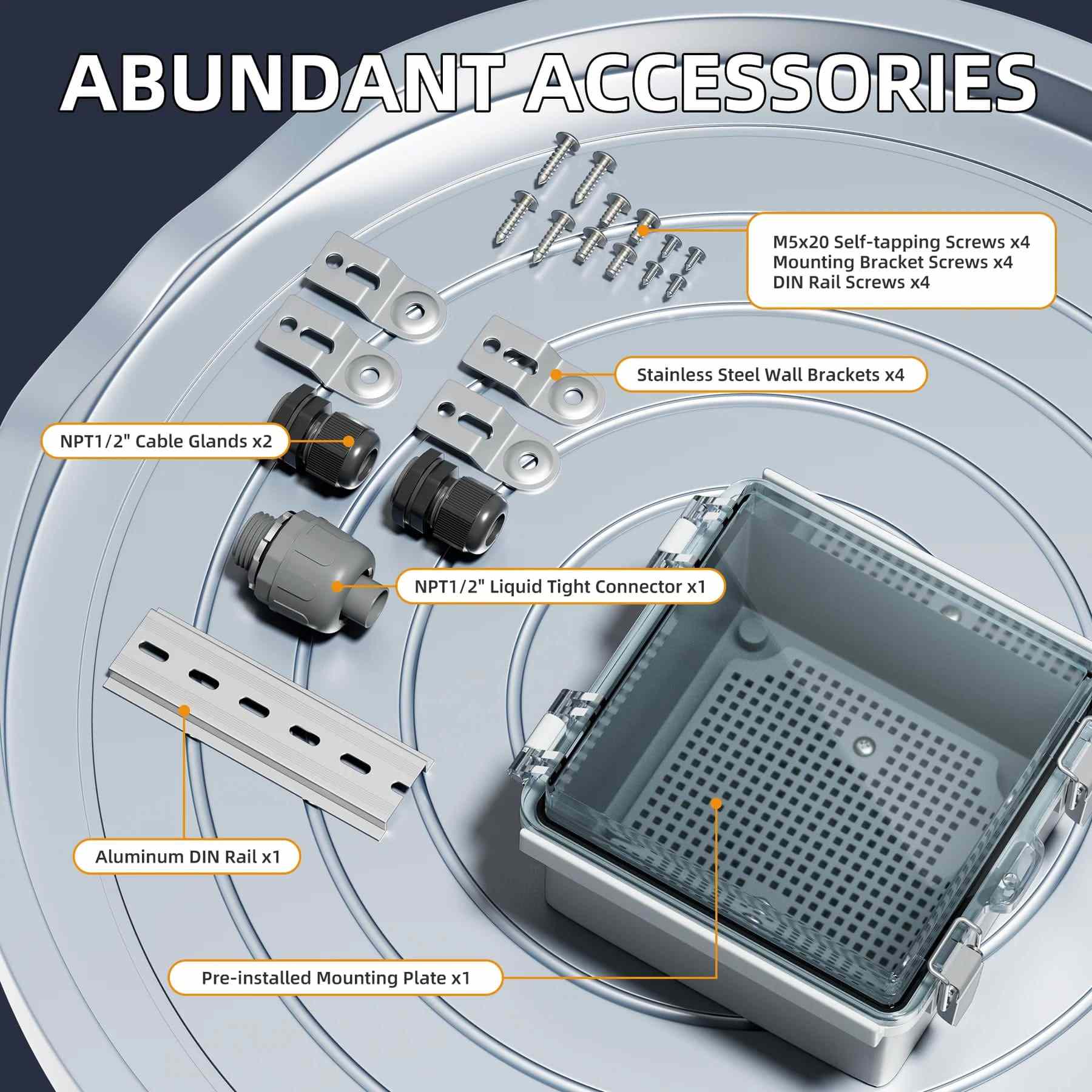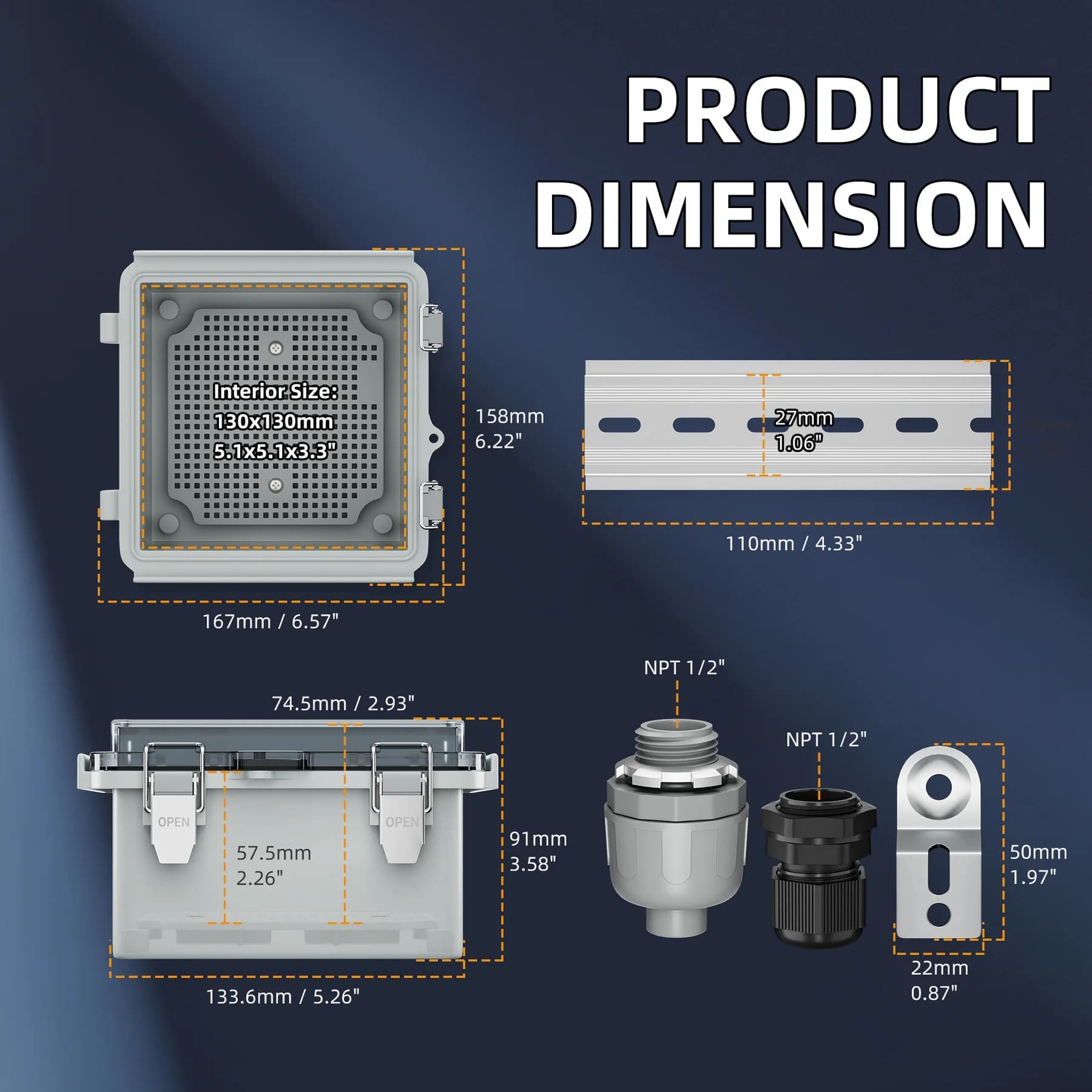 La scatola presenta un robusto chiusura in acciaio inossidabile per una chiusura sicura e una durata a lungo termine, mentre la rotaia DIN in alluminio incluse in alluminio semplifica il montaggio di componenti elettrici come interruttori, relè e interruttori. Costruito in plastica ABS di alta qualità, questo recinto non solo resiste a fattori ambientali duri ma mantiene anche forti prestazioni del segnale WiFi.